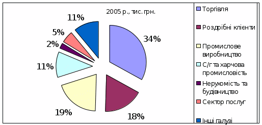 За даними фінансової звітності ВАТ „Кредитпромбанк” кредити надаються головним чином клієнтам, що здійснюють свою діяльність на території України в таких галузях економіки, як торгівля, роздрібні клієнти, промислове виробництво, сільське господарство та харчова промисловість, нерухомість та будівництво, сектор послуг, спорт та відпочинок, транспорт, фінансові послуги, тощо (рис. 2.4. та 2.5.).