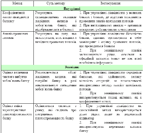 Науковці, серед методів, які використовуються при оцінці ліквідності, виділяють методи внутрішньої та зовнішньої оцінки ліквідності (табл. 1). До методів внутрішньої оцінки ліквідності належать: коефіцієнтний аналіз ліквідності балансу та аналіз грошових потоків (як різновид – оцінка величини чистого вибуття зобов’язань банку).
