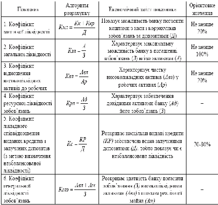 3. Коефіцієнти, що дають можливість визначити здатність виконання банком своїх зобов’язань за рахунок ліквідних активів.