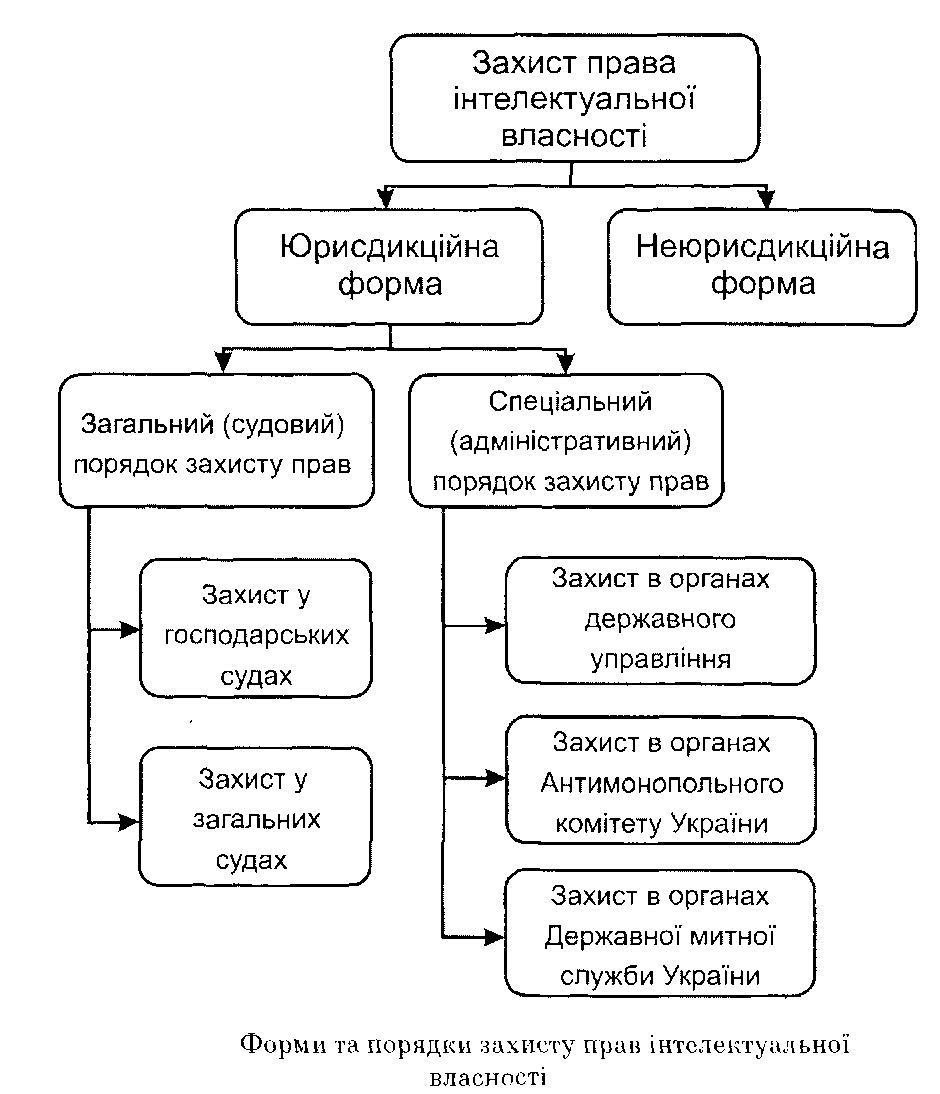 В Україні є дві форми захисту прав інтелектуальної власності: юрисдикційна та неюрисдикційна (рис. 8.1). Неюрисдикційна форма передбачає захист права інтелектуальної власності своїми силами, без звернення по допомогу до державних або інших компетентних органів, тобто самозахист. Наприклад, це може бути відмова здійснити певні дії, передбачені укладеним договором про передачу (уступку) майнових прав інтелектуальної власності або ліцензійним договором, відмова від виконання недійсного договору тощо. Обрані засоби самозахисту мають бути не забороненими законодавством та не повинні суперечити моральним засадам суспільства [117].