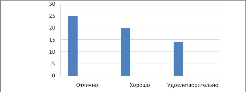 Результаты диаграммы наглядно отображают, что 25 студентов защитили проекты на «отлично», 20 – «хорошо», 14 – «удовлетворительно».