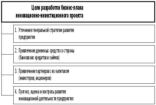 Четвертая цель разработки бизнес-плана состоит в прогнозировании, оценке и последующем контроле за развитием инновационной деятельности предприятия, осуществляемой на основе реализации соответствующего инновационного замысла.