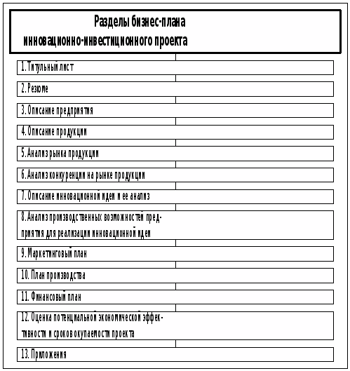 Из рис.3 видно, что в общем случае бизнес-планы инновационно-инвестиционных проектов могут иметь 13 разделов, неодинаковых по объему, но каждый по-своему необходимых.