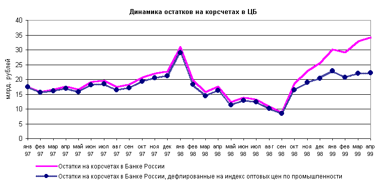 Начиная с конца сентября 1998 г., Банк России начал активно кредитовать Правительство, отдельные банки, что привело к избыточному всплеску ликвидности в банковскую систему. Эта избыточность выразилась в накапливании огромных рублевых средств у банковской системы (до 20 млрд. руб. в отдельные моменты), которые не находили своего применения и были размещены на депозитах в Банке России, в повышенном росте цен в конце 1998 г. и в снижении курса рубля более чем 50% к концу первого квартала 1999 г. по сравнению с началом ноября 1998 г.