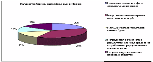 В начале и середине 1990 гг. можно было наблюдать и слабую исполнительную дисциплину. Банки закрывались не только по причине отзыва лицензий, они наказывались за целый ряд нарушений. Так, только за пять месяцев в 1994 г. по Москве было оштрафовано 154 коммерческих банка. (см. Рис.1.5 2)