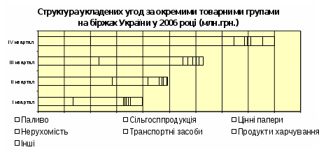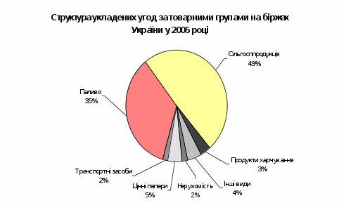 У структурі спотових угод переважну більшість становили угоди із сільськогосподарської продукції – 43,4 відсотка, палива – 40,5 відсотка, цінних паперів – 5,1 відсотка; форвардних угод – з сільськогосподарської продукції – 81,4 відсотка, продуктів харчування -18 відсотка. Було укладено 481 ф'ючерсні угоди на суму 63,1 млн. гривень, що у 4 рази менше, ніж за 2005 рік. Структура укладених угод за товарними групами на біржах України у 2006 році наведена у діаграмі 1.