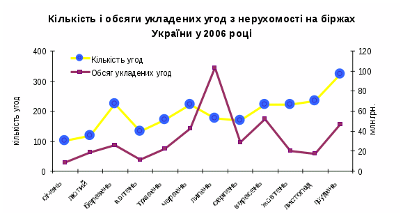 Порівняно з 2005 роком на Україні обсяги укладених угод з палива збільшились у 2,6 рази; з цінних паперів знизились у 2,5 рази, сільськогосподарської продукції знизились на 7 відсотків.