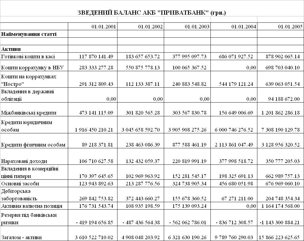 Таблица Б.1 Баланс АКБ „Приватбанк” за 2000 – 2004 года