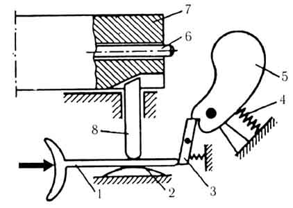 1 — спусковой крючок; 2 — пружина разобщителя, 3 — шептало; 4 — боевая пружина; 5 — курок; 6 — ударник; 7 — затвор; 8 — разобщитель