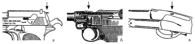 Сигнальные устройства указывают на наличие патрона в патроннике или на взведенное положение ударно-спускового механизма. Это, как правило, сигнальные спицы (Вальтер П-38, ПП), высоко поднимающийся выбрасыватель с надписью, которую видно при его поднятом положении («Парабеллум»), сигнальные штифты на замочных досках или колодке у охотничьего оружия со скрытыми курками (рис. 9.).
