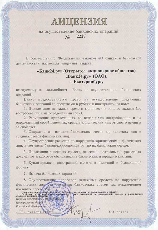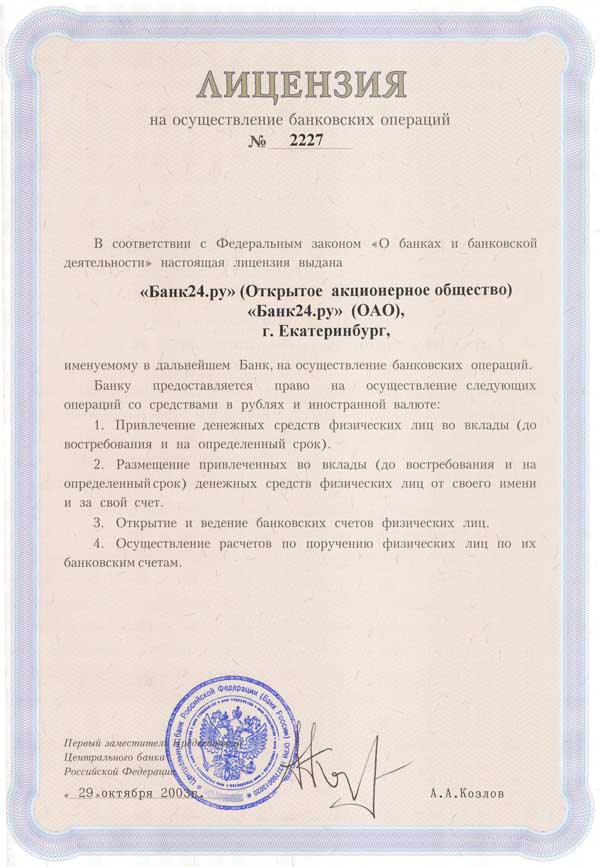 «Банк 24.Ру» зарегистрирован в декабре 1992 года в Екатеринбурге под именем «Уралконтактбанк» (сменил название на Банк 24.Ру в июне 2003 года). Лицензия на совершение банковских операций - расширенная валютная (от 29.10.2003). Организационно-правовая форма на текущий момент - открытое акционерное общество.