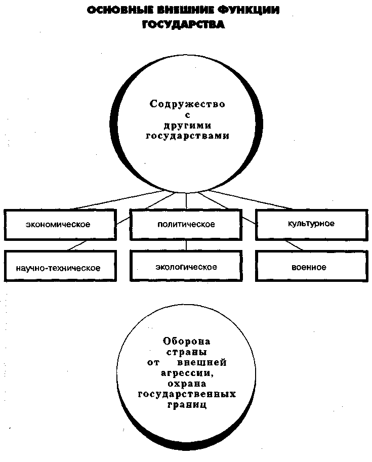 Внешние функции государства представляют собой основные направления его деятельности на международной арене. Они призваны решать следующие внешние задачи государства: установление и поддержание нормальных отношений с другими государствами и обеспечение обороны страны от возможной внешней агрессии. В соответствии с указанными задачами различаются две основные внешние функции государства: взаимовыгодное сотрудничество со всеми другими государствами мирового сообщества и оборона страны от нападения извне. (См.: приложение № 3)