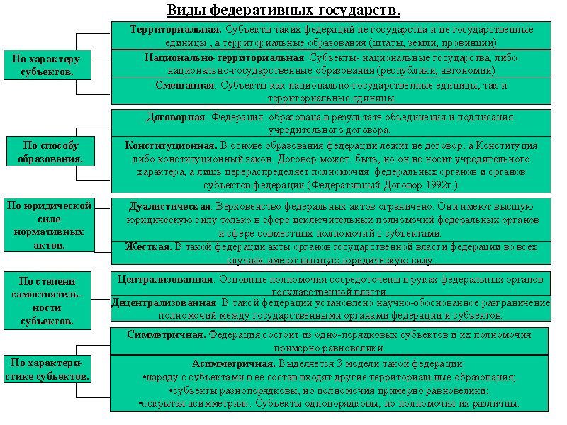 4-ая классификация - с учетом правового положения субъектов федерации, отсюда все федерации подразделяются на симметричные и асимметричные. Симметричные - это федерации, состоящие из равноправных и одно-порядковых субъектов - Аргентина. Асимметричные подразделяются на три вида (типа). К первому виду относятся федерации, в состав которых помимо субъектов входят и другие территориальные образования, которые субъектами не являются, но имеют определенное правовое положение (федеральный округ, федеральные территории - США). Ко второму виду относятся федерации, состоящие из разно-порядковых субъектов. Правовое положение этих субъектов также различается - Россия. 3-я разновидность – это федерации, состоящие из одно-порядковых, но не равноправных субъектов -ФРГ.
