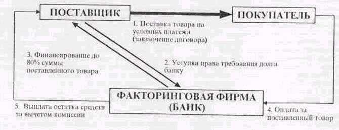 В результате сегодня некоторые банки, несмотря на существующие проблемы, все же развивают новый вид кредитования - факторинговое обслуживание, которое представляет собой переуступку неоплаченных долговых требований (счетов фактур и векселей), возникающих между контрагентами в процессе реализации товаров и оказания услуг на условиях коммерческого кредита, факторинговому отделу банка чаще всего на условиях немедленной оплаты до 90% от стоимости поставок и уплаты остальной части, за вычетом процента за кредит и комиссионных платежей, в строго обусловленные сроки независимо от поступления выручки от дебиторов, при этом факторинговый отдел банка также берет на себя бухгалтерское, информационное, сбытовое, страховое, юридическое и другое обслуживание поставщика.