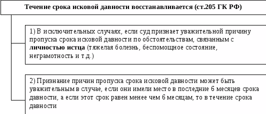 В исключительных случаях, когда суд признает уважительной причину пропуска срока исковой давности по обстоятельствам, связанным с личностью истца (тяжелая болезнь, беспомощное состояние, неграмотность и т.п.), нарушенное право гражданина подлежит защите. Причины пропуска срока исковой давности могут признаваться уважительными, если они имели место в последние шесть месяцев срока давности, а если этот срок равен шести месяцам или менее шести месяцев - в течение срока давности.