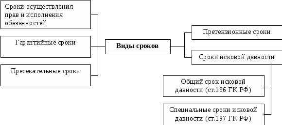 Сроки могут устанавливаться законом, причем такие сроки нельзя изменить соглашением сторон и договором. Важное значение имеет деление на сроки осуществления гражданских прав, сроки исполнения обязанностей и сроки защиты гражданских прав. К срокам осуществления гражданских прав относятся сроки, в течение которых управомоченный субъект может сам реализовать принадлежащее ему право либо потребовать совершения определенных действий от обязанного лица. Сроки осуществления гражданских прав, в свою очередь, делятся на сроки существования гражданских прав, пресекательные, претензионные, сроки годности и др.