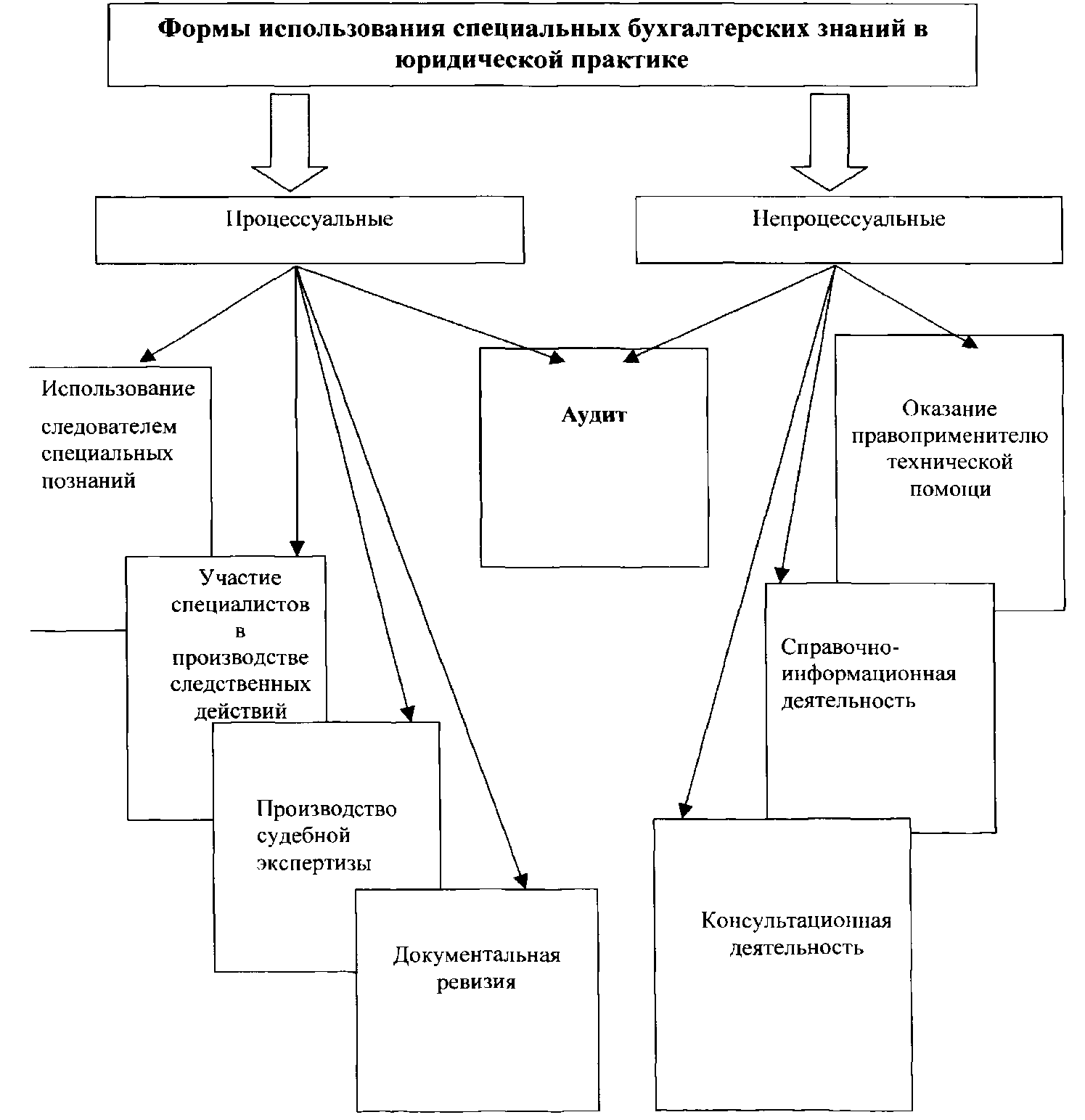 В юридической литературе существуют различные мнения по формам применения специальных знаний в судопроизводстве. Грешников П.Я. отмечает, что специальные познания применяются в основном в трех формах: участие специалиста в расследовании и рассмотрении дел, документальная ревизия и судебно - бухгалтерская экспертиза.