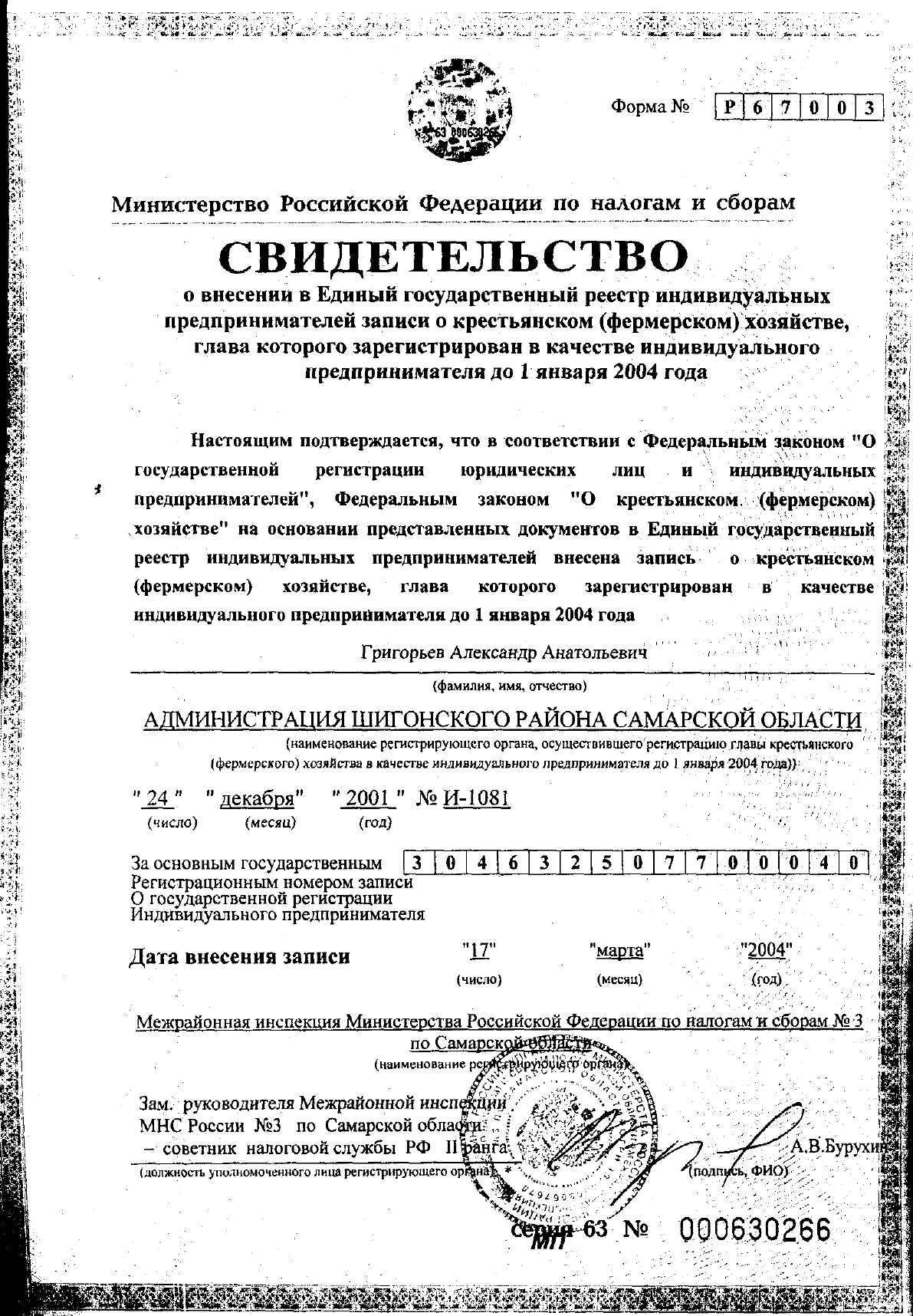 46 Приказ МНС РФ от 03.12.2003 № БГ-3-09/664 (ред. от 16.02.2004) « Об утверждении форм документов, используемых при государственной регистрации крестьянских (фермерских) хозяйств»//Российская газета.- 2004.- 16 января.