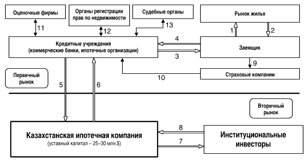 4. Инициатором внедрения системы ипотечного кредитования в Казахстане выступил Нацбанк, избравший в качестве прототипа малазийскую модель. В ее основе лежит западное ноу-хау — двухуровневая структура рынка, благодаря которой банки аккумулируют на рынке ценных бумаг «долгие» целевые деньги, предназначенные для ипотеки, и имеют возможность давать столь же «долгие» и «мягкие» (под невысокий процент) жилищные кредиты. Первичный уровень здесь — сами кредиты, а вторичный — специальные ипотечные ценные бумаги (облигации, закладные), с помощью которых происходит подпитка банков-кредиторов.