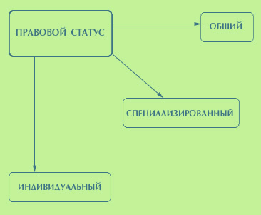 Каждый субъект права обладает общим правовым статусом. Это совокупность право- и дееспособности, необходимых для возникновения конкретных правоотношений, а также общих прав и обязанностей, реализация которых не порождает конкретные правоотношения (свобода слова, обязанность исполнять законы и др.). Он в принципе един для всех граждан. Кроме того, существует понятие индивидуального правового статуса - совокупности правоотношений, стороной которых выступает то или иное лицо. Такой статус различен для конкретных индивидов. Наконец, есть понятие специализированного правового статуса, под которым понимается совокупность прав и обязанностей определенной категории субъектов (пенсионеры, военнослужащие, лица с высшим медицинским образованием и др.).