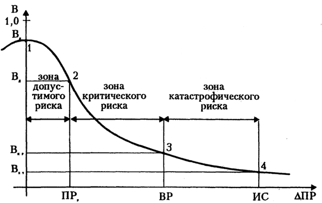 Поскольку основная задача предпринимателя кредитозаемщика — рисковать расчетливо, не переходя ту грань, за которой возможно банкротство фирмы, следует выделять допустимый, критический и катастрофический риски. Допустимый риск — это угроза полной потери прибыли от реализации того или иного проекта или от предпринимательской деятельности в целом. В данном случае потери возможны, но их размер меньше ожидаемой предпринимательской прибыли; таким образом; данный вид предпринимательской деятельности или конкретная сделка, несмотря на вероятность риска, сохраняют свою экономическую целесообразность.