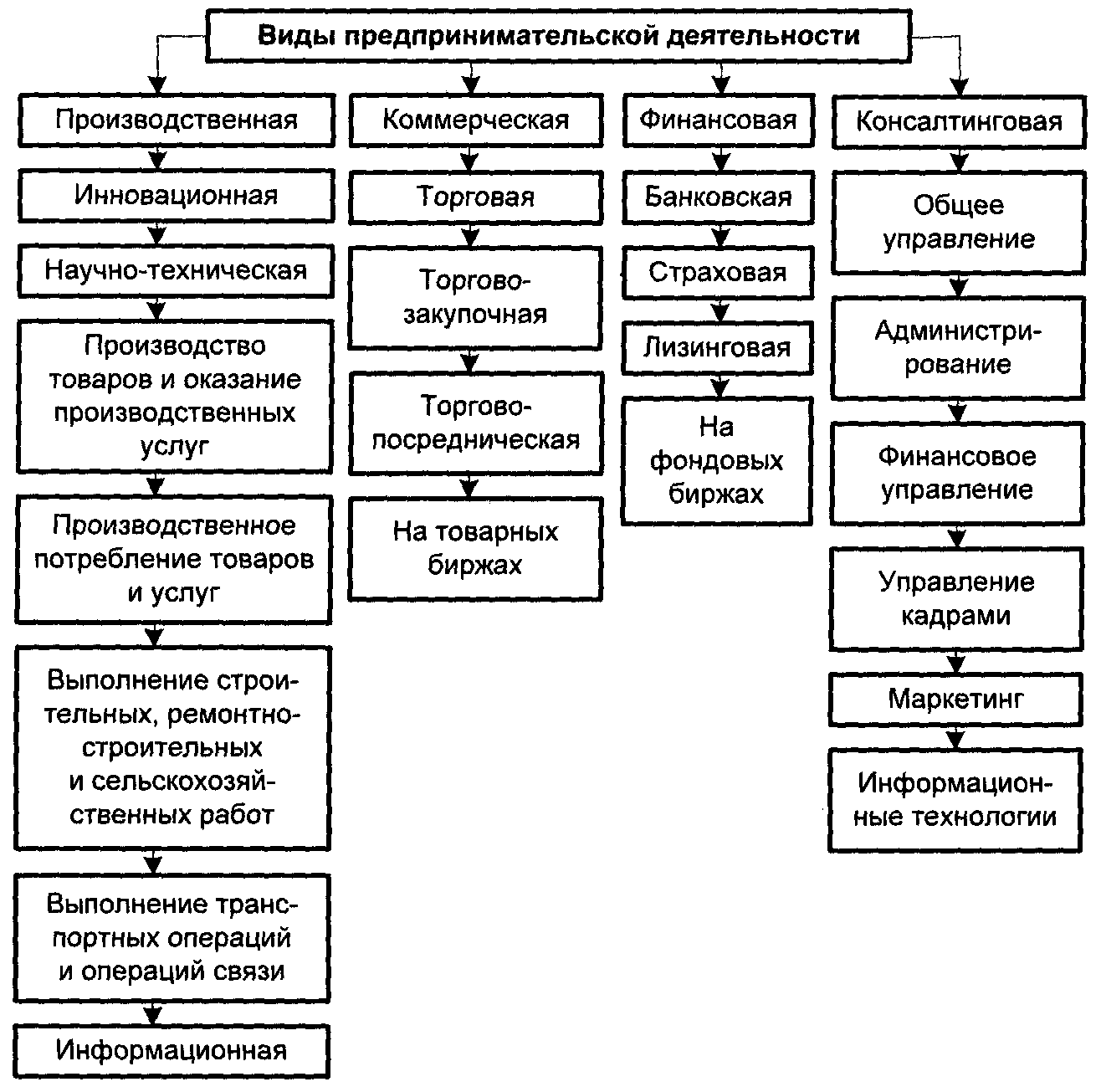 По виду или назначению предпринимательскую деятельность можно подразделить на производственную, коммерческую, финансовую, консультативную и др. Все эти виды деятельности могут функционировать раздельно или вместе.