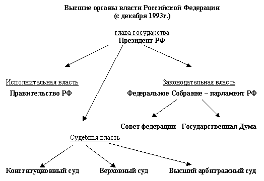 12 декабря 1993 г. всенародным голосованием была принята Конституция РФ. Россия объявлялась демократическим федеративным правовым государством с республиканской формой правления. Главой государства являлся всенародно избираемый президент. В состав РФ входили 21 республика и 6 краёв, 1 автономная область и 10 автономных округов, 2 города федерального значения (Москва и Санкт-Петербург) и 49 областей. Законодательно закреплялась двухпалатная структура Федерального Собрания - постоянно действующего законодательного органа РФ. К ведению высших органов власти России были отнесены: принятие законов и контроль за их исполнением, управление федеральной государственной собственностью, основы ценовой политики, федеральный бюджет. Им также принадлежало решение вопросов внешней политики и международных отношений, объявление войны, заключение мира.