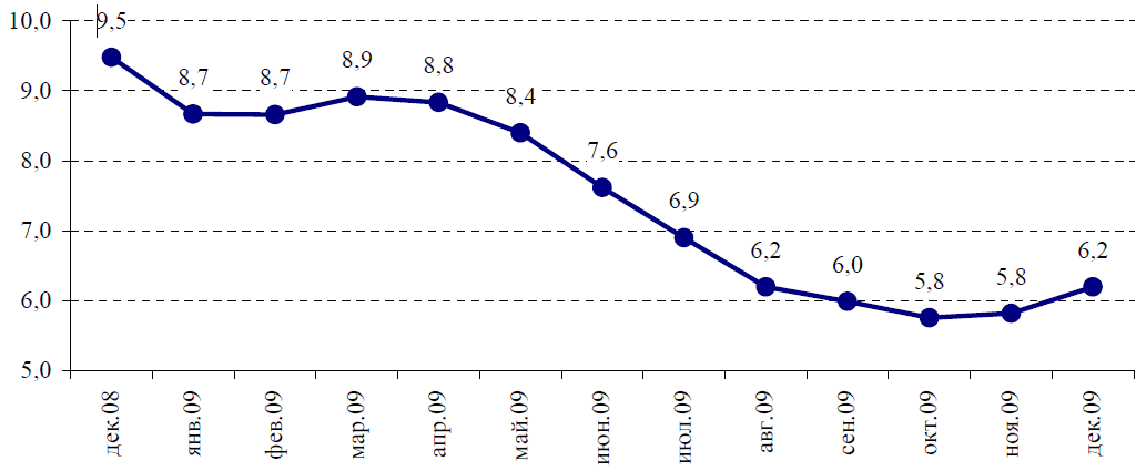 По итогам 2009 года инфляция сложилась на уровне 6,2%. Данный уровень инфляции в 1,5 раза ниже по сравнению с инфляцией 2008 года. (Рис. 2.9.)