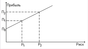 Из графика видно, что нулевой риск обеспечивает самый низкий доход (0; П0), а при самом высоком риске Р = Р2 прибыль имеет наиболее высокое значение П = П2 (П2 > П1> П0). Иными словами, для получения экономической прибыли предприниматель должен осознанно пойти на принятие рискового решения.