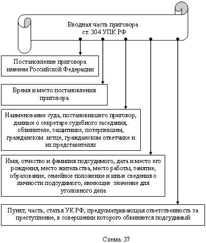 Согласно ст. 304 УПК РФ, в вводной части приговора указывается (схема 37):