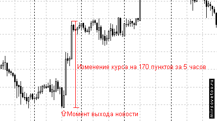 На графике вы видите, что в момент выхода новости начался бурный рост курса евро, и за 5 часов цена валютной пары евродоллар изменилась на 170 пунктов. Пункт – это в ценовом выражении стоимости валюты 4-й знак после запятой, и изменения курса рассматривают именно в пунктах. Т.е. если 1 евро стоил 1,4555 доллара, а потом цена стала 1,4565, то говорят, что курс вырос на 10 пунктов, а не на 0,10 цента. Стоимость одного пункта в паре евродоллар составляет 10$, следовательно, за 5 часов можно было заработать 1700$.