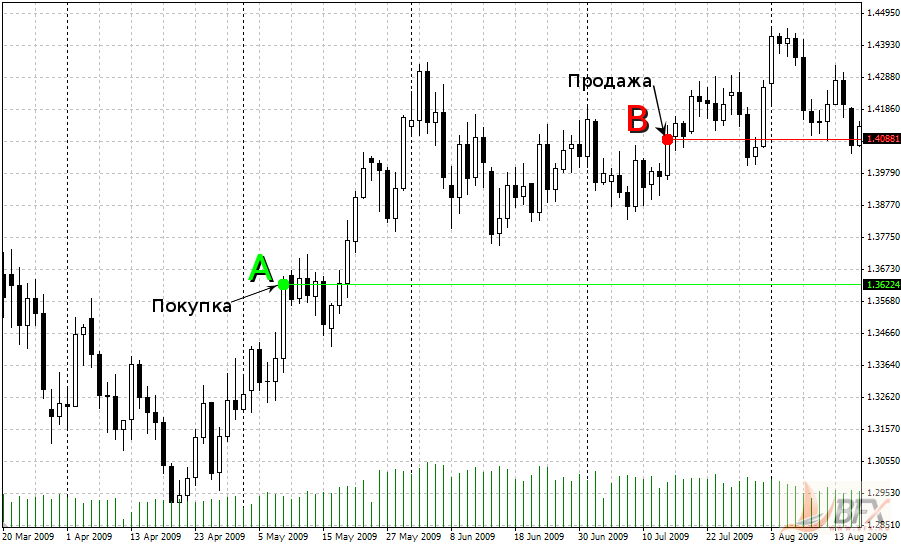 Действия трейдера в упрощенном варианте заключаются в том, что он дает распоряжения на открытие или закрытие позиции. Распоряжение может быть как на покупку, так и на продажу валюты. Например, вы выбрали валютную пару, где, по вашему мнению, стоимость базовой валюты имеет тенденцию к росту. Вы даете распоряжение по этой паре купить определенное количество базовой валюты, тем самым открываете позицию (точка A на рисунке). Когда в соответствии с вашими ожиданиями стоимость базовой валюты достаточно выросла, и ждать дальнейшего роста не следует, так как существует опасность смены тенденции, вы даете распоряжение закрыть позицию, то есть продать то количество базовой валюты, которое вы ранее приобрели (точка B на рисунке). При этом ваша прибыль фиксируется: она не будет возрастать, и не будет уменьшаться в связи с изменением курса. Пока же вы находились в открытой позиции, вы имели возможность наблюдать рост прибыли при благоприятной тенденции, но одновременно были подвержены риску уйти в убыток в связи со сменой тенденции.