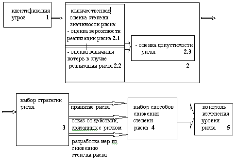 Управление можно определить как одну из стратегий, используемую при осуществлении деятельности в условиях риска. Управление риском предусматривает выбор одной из альтернатив: принятия риска, отказ от деятельности, связанной с риском или применение мер по снижению риска, на основе предварительной оценки степени риска.Управление риском включает следующие этапы: идентификацию риска, оценку риска, выбор стратегии риска (принятие решения о принятии риска, отказе от действий, связанных с риском или снижения степени риска), выбор и применение способов снижения степени риска, контроль уровня риска.