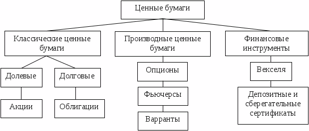 Рынок ценных бумаг является частью финансового рынка, охватывает отношения, связанные с выпуском и обращением ценных бумаг. В качестве объектов выступают такие виды ценных бумаг, как акции, облигации, векселя, депозитные и сберегательные сертификаты, опционы, фьючерсы, варранты и др.