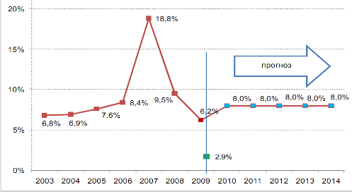 Инфляция за январь-март 2010 г. составила 2,9% или около половины годовой инфляции за 2009 г. (6,2%). На 2010-14 гг. Министерства экономики и бюджетного планирования РК прогнозирует годовую инфляцию на уровне 6,0-8,0% (рисунок 2.1).