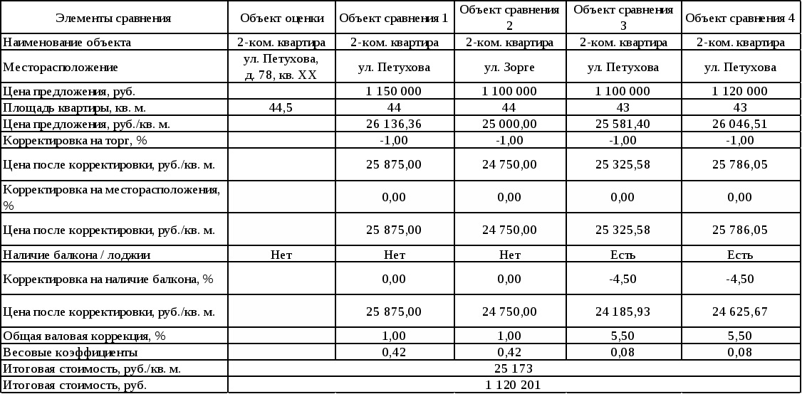 Вывод: рыночная стоимость двухкомнатной квартиры, расположенной по адресу: г. Новосибирск, ул. Петухова, д. 78, кв. ХХ, по состоянию на 01 ноября 2010 г., рассчитанная доходным подходом, округленно составляет: 1 060 000 рублей.