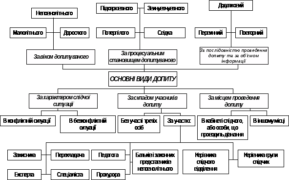 Види допиту (див. рис. 1) на попередньому слідстві відрізняються залежно від: