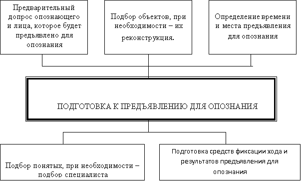 Подготовка к этому следственному действию является обязательным криминалистическим и процессуальным условием успеха опознания. Планируя предъявление для опознания, следует предусмотреть: цель этого следственного действия, провести предварительный допрос опознающего об обстоятельствах, при которых он наблюдал соответствующее лицо или предмет, о приметах и особенностях, по которым он может провести опознание; осуществить подбор объектов, среди которых будет предъявляться; определить выбор времени и места предъявления для опознания, приглашение лиц, которые должны участвовать при проведении этого следственного действия.
