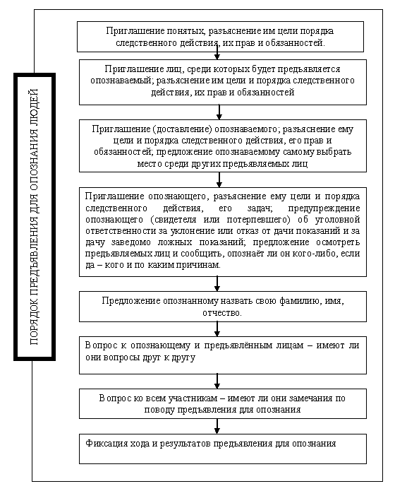При проведении предъявления для опознания следователь не должен довольствоваться кратким утверждением опознающего, что он не ошибся и твердо, категорически опознает объект. К сказанному опознающим необходимо требовать, чтобы он подробно перечислил и разъяснил конкретные признаки, по которым у него сложилось мнение о том, что перед ним именно тот объект, который он видел при обстоятельствах, исследуемых по делу. Если опознающий не может перечислить признаков объекта, по которым он опознает его, в таком случае достоверность опознания всегда может быть поставлена под сомнение. Поэтому следователю целесообразно перед опознанием подготовить опознающего: разъяснить ему положение закона, порядок проведения опознания, а при необходимости дать прочесть опознающему его собственные показания в протоколах допросов, на что он имеет право.