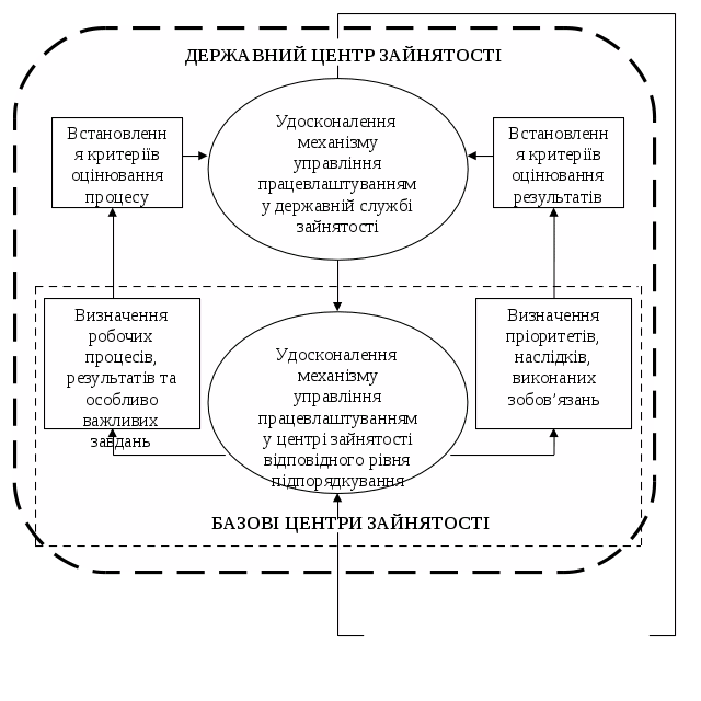 На основі цих інформаційних потоків базові центри зайнятості мають можливість самостійно ініціювати зміни у механізмі управління працевлаштуванням незайнятих громадян у державній службі зайнятості і розробляти рекомендації Державному центру зайнятості щодо коригування управлінських цілей. У той же час за Державним центром зайнятості зберігається право встановлювати критерії оцінювання процесу і результатів, які доводяться до базових центрів зайнятості у вигляді управлінських впливів щодо вдосконалення методів управління.