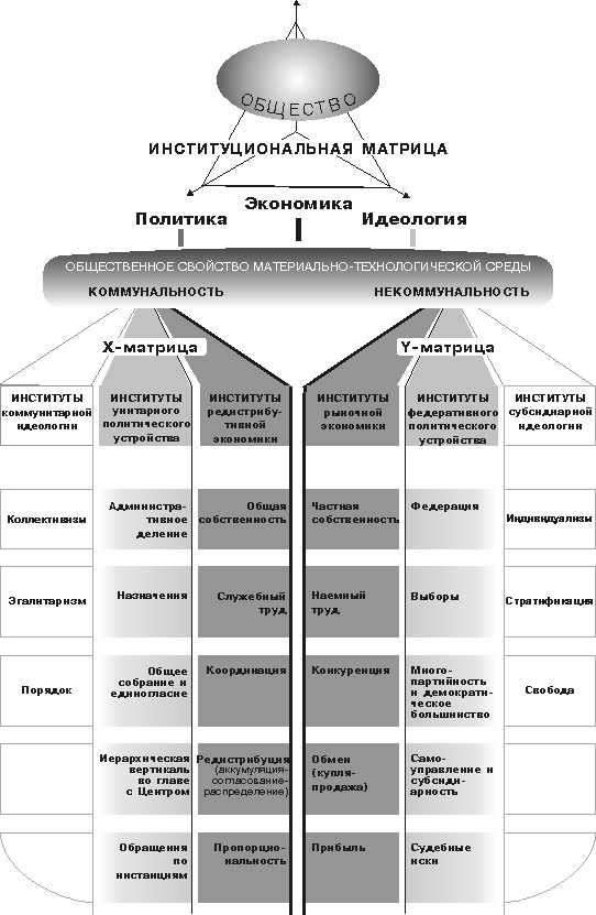 Попыткой теоретического объяснения устойчивой специфики федерализма в странах с определенным типом исторического развития явилась созданная в конце 90-х годов теория институциональных матриц, согласно которой общественная жизнь любой страны находится под воздействием т.н. институциональной матрицы, представляющей собой систему базовых институтов, регулирующих воспроизводство основных общественных подсистем - экономики, политики и идеологии. Носителем институтов рыночной экономики, федерализма и субсидиарности3 является институциональная матрица Y, характерная для США и большинства стран Европы, а также противоположных черт - редистрибутивной экономики1, унитарного политического устройства и коммунитарности2, присущих России и большинству стран Азии - матрица X.