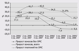 В 4-ом квартале 2008 года темпы прироста взносов существенно сократились, но еще оставались положительными (1,0%). В 2009 году темпы прироста взносов без учета ОМС стали отрицательными: -7,6% в 1-ом квартале и -8,6% во 2-ом квартале. [рис.1]