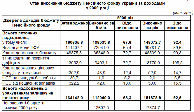 У 2009 році загальні надходження до бюджету Пенсійного фонду забезпечили здійснення його видатків на 89,7 відсотка.