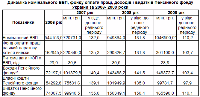 Аналіз динаміки ВВП, показників бюджету Пенсійного фонду та фонду оплати праці за 2006 - 2009 роки свідчить про випереджаючі темпи зростання видатків Пенсійного фонду порівняно з ростом ВВП та фонду оплати праці. Динаміка номінального ВВП, фонду оплати праці, доходів і видатків Пенсійного фонду за 2006-2009 роки:
