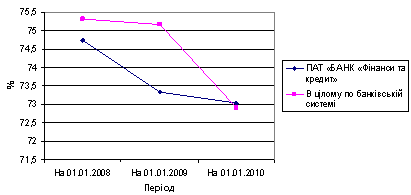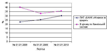 Оцінка діючої системи управління ліквідністю в ПАТ "Банк "Фінанси та Кредит" була здійснена на основі аналізу розривів активів та пасивів з відповідними строками погашення (ГЕП-аналіз); дотримання встановлених обов’язкових економічних нормативів ліквідності, а також з використанням коефіцієнтного методу. Проведений нами аналіз ліквідності банку "Фінанси та Кредит" за останні три роки (2007-2009 рр.) дає підстави для наступних висновків: ризик ліквідності в банку знаходиться на достатньому рівні, але при цьому треба відзначити, що він є цілком контрольованим з боку менеджменту банку. Про це свідчить ГЕП-аналіз-кумулятивний розрив між активами та пасивами значно перевищує норму в 10% (станом на 01.01.2010 р. кумулятивний розрив складає 24,91%), а також значення обов’язкових економічних нормативів ліквідності, які перевищують нормативні вимоги Національного банку України. Результати ГЕП-аналізу активів та пасивів банку свідчать про негативну тенденцію ліквідності, яка спостерігалась протягом 2007 року та продовжувалась в 2008 р. та пов’язана із поступовим покращенням збалансованості структури активів та пасивів та зменшенням ризику незбалансованої ліквідності в 2009 році. Такі зміни були зумовлені, в першу чергу затвердженням в 2009 році нової стратегії та тактики на всіх організаційних рівнях, яка забезпечила контроль збалансованості обсягів активно-пасивних операцій, а також покращенням загальекономічної ситуації в країні. В підтриманні ліквідності в кризовий період значну роль зіграли кошти рефінансування, які надавав Національний банк України. Стабілізація ліквідності банку пов’язана ще із стабілізацією ситуації на вітчизняному ринку депозитів – в другому півріччі 2009 року припинився відтік депозитів з банківської системи.