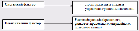 балансовий ризик ліквідності -тобто ризик того, що банк у певний момент часу не зможе виконати свої зобов’язання за рахунок наявних ліквідних активів унаслідок неадекватної структури балансу та незбалансованості між обсягами і термінами погашення активів і пасивів;