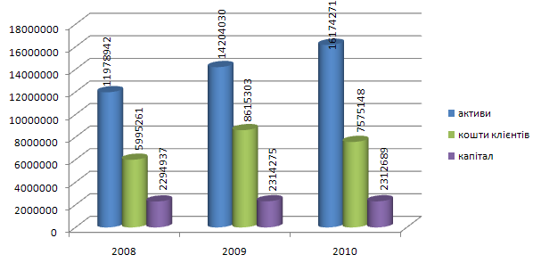 Зобразимо графічно основні показники банку за 2008-2010 рр. на основі даних Балансу (Додаток А-Б) [26]: