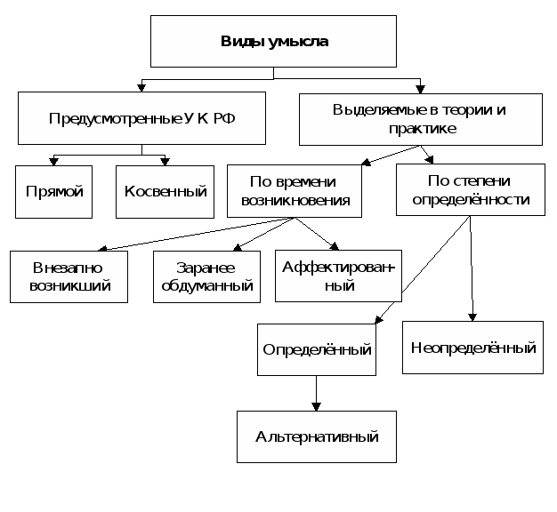 Помимо деления умысла на прямой и косвенный теория и практика уголовного права знают и иные классификации видов умысла. Иногда в литература этот факт искажается в утверждении, что помимо прямого и косвенного умысла сушествуют и другие его виды (определенный, неопределенныий и т.д.). На самом деле все эти виды умысла по содержанию интеллектуального и воливого моментов отностятся либо к прямому, либо к косвенному и не представляют качественно отличных от них разновидностей умысла. Одним из таких оснований является момент формирования умысла. По этому признаку умысел принято делить либо на три вида: