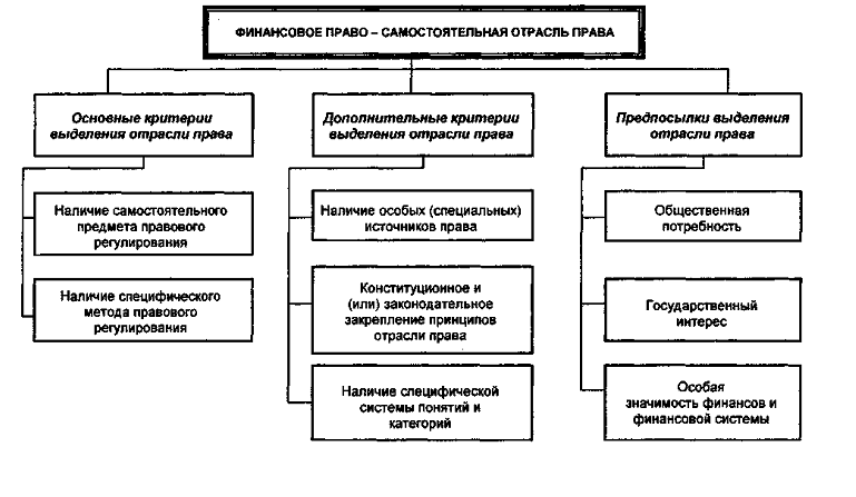 Предпосылки выделения отрасли права: наличие общественной потребности и государственного интереса в самостоятельном правовом регулировании названной отрасли, обусловленное особой значимостью финансов и финансовой системы для выполнения задач и функций государства.