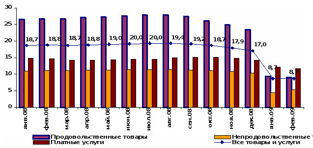 В среднегодовом выражении уровень инфляции в январе-феврале 2009 года к соответствующему периоду прошлого года составил 8,7% по сравнению с 18,8% в январе-феврале 2008 года.